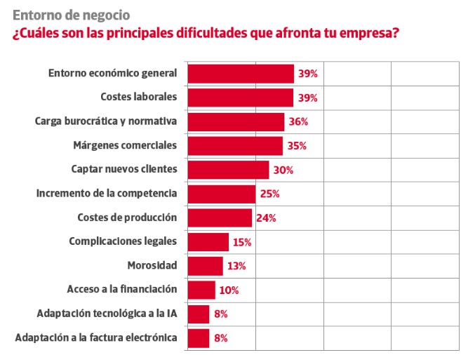 Cabe destacar que un 13% de las empresas sitúa entre sus principales preocupaciones el impacto de la morosidad, dos puntos por encima de los niveles registrados en 2024, lo que aflora una visión pesimista sobre la evolución de los impagos para los próximos meses. Además, un 10% asegura tener dificultades para obtener financiación.