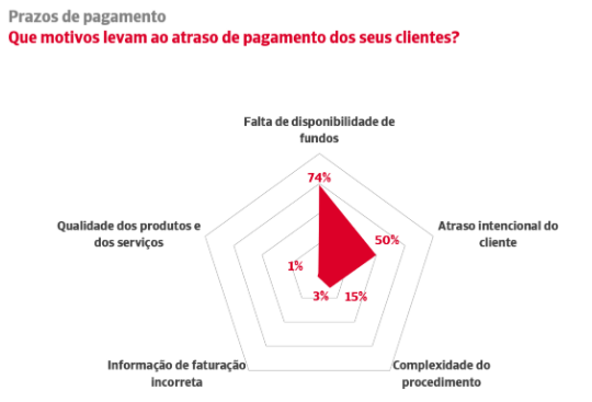 Ao abordar as razões que explicam os atrasos nos pagamentos, a falta de disponibilidade de fundos (74%) é o motivo mais indicado, antes do atraso intencional dos clientes (50%). A complexidade dos procedimentos de pagamento (15%), a emissão de faturas incorretas (3%) ou as disputas quanto à qualidade dos bens e serviços fornecidos (1%) completam os motivos apresentados pelos clientes para atrasar os seus pagamentos.
