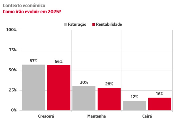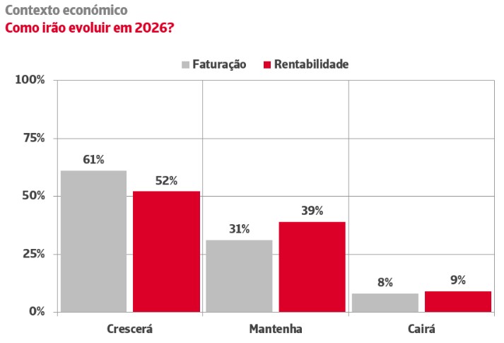 Apesar do contexto de risco de crédito descrito no estudo ser complexo, a maioria das empresas espera fechar 2025 com crescimentos, tanto no volume de negócios (57%), como no lucro (56%), bem acima da percentagem que prevê quedas nos dois indicadores (12% e 16%, respetivamente). O tecido produtivo nacional mostra confiança de que conseguirá manter esta dinâmica em 2026: 61% das empresas portuguesas esperam que os níveis de volume de negócios continuem a recuperar, em comparação com 8% que esperam que o próximo ano seja pior do que este em termos de receitas.