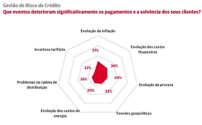 74% das empresas detetam algum tipo de deterioração nos níveis de solvência ou liquidez dos seus clientes. Uma das novidades de 2025 é que a perturbação provocada pela evolução dos preços é moderada: A inflação é apontada como fator desestabilizador do comportamento de pagamento e solvência dos clientes por 37% das empresas, uma percentagem ainda muito elevada, mas cinco pontos abaixo da registada há um ano. O impacto dos custos financeiros também caiu sete pontos, para 30% das empresas, e os custos de energia caíram cinco pontos, para 20%.