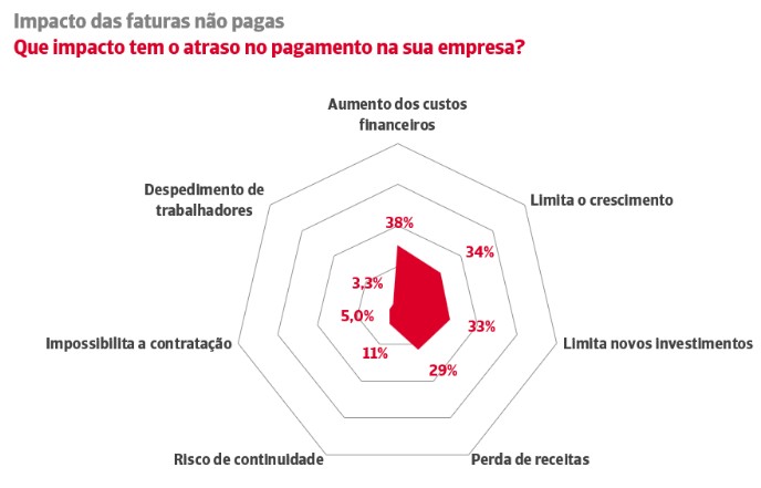 Segundo o Estudo, 38% das empresas portuguesas enfrentam um aumento dos custos financeiros devido a atrasos nos pagamentos. O atraso nos pagamentos aos clientes significa também que 34% do tecido empresarial tem de abrandar a sua expansão comercial, 33% é forçado a limitar novos investimentos e 29% sofre perdas de rendimentos significativas.