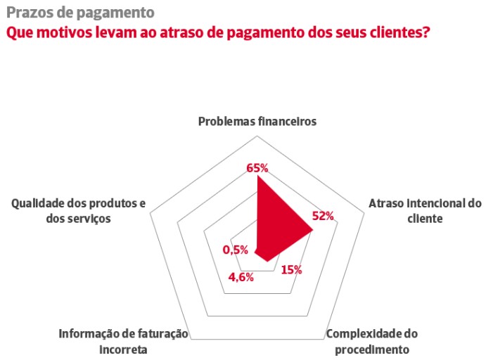 65% das empresas relatam problemas financeiros nos seus clientes. A falta de liquidez é a razão mais citada para explicar a morosidade nos pagamentos, à frente do atraso intencional (52%), da complexidade dos procedimentos de pagamento (15%), da emissão de faturas incorretas (4,6%) ou das discrepâncias quanto à qualidade dos bens ou serviços fornecidos (0,5%).
