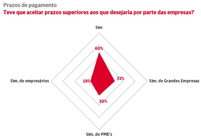 60% das empresas, nove pontos a mais do que há um ano, têm de aceitar prazos de pagamento superiores aos desejados para poderem manter as suas carteiras de clientes nas operações B2B. A capacidade dos profissionais independentes para imporem prazos de pagamento situou-se nos 18%. No caso das PME, este valor atinge os 30% e nas Grandes Empresas é de 33%.