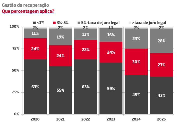 Quando são iniciadas ações de cobrança, a grande maioria das empresas renuncia à cobrança de juros de mora; 70% das empresas nunca os aplicam e apenas 2% são sistemáticas no exercício do seu direito. O endurecimento da política monetária por parte do Banco Central Europeu fez com que os juros de mora subissem até ao máximo de 12,5% em 2024. Atualmente, esta taxa está fixada em 11,5%. No entanto, a evolução deste indicador oficial não tem tradução na economia real. De acordo com o estudo realizado pela Crédito y Caución e Iberinform, 98% das empresas que aplicam juros de mora reclamam montantes inferiores aos que lhes corresponderiam por lei.
