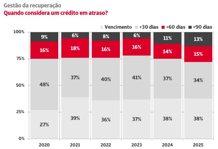 O atraso nas ações de cobrança implica uma deterioração da eficácia das ações de recuperação. Apesar disso, o estudo reflete uma grande flexibilidade nos prazos de cobrança como parte da relação comercial; 28% das empresas permitem aos seus clientes atrasos de pagamento superiores a 60 dias antes de considerarem um crédito em atraso.