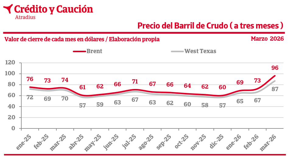 Los precios del barril Brent y West Texas cierran en 96 y 87 dólares, respectivamente, en marzo de 2026.