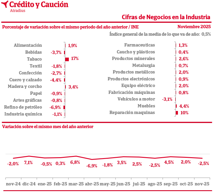 La cifra de negocios de la industria en noviembre de 2025 en España crece un 0,5% interanual, según los datos del INE.