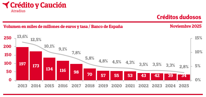 Según los datos provisionales extraídos por Crédito y Caución del último Boletín Estadístico que mensualmente publica el Banco de España, en el mes de noviembre de 2025, el volumen de créditos de dudoso cobro sumaba 34.211 millones de euros, lo que situó la tasa de morosidad bancaria en el 2,8% del total de crédito concedido.