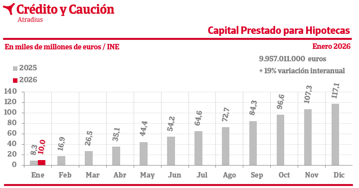 El capital prestado para hipotecas en enero de 2026 crece un 19% interanual, según los últimos datos del INE.
