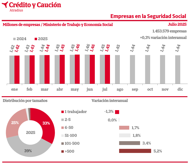 Según los datos de cotización del Ministerio de Trabajo, el número de empresas activas en julio de 2025 varió un 0,3% frente a los valores de hace un año.