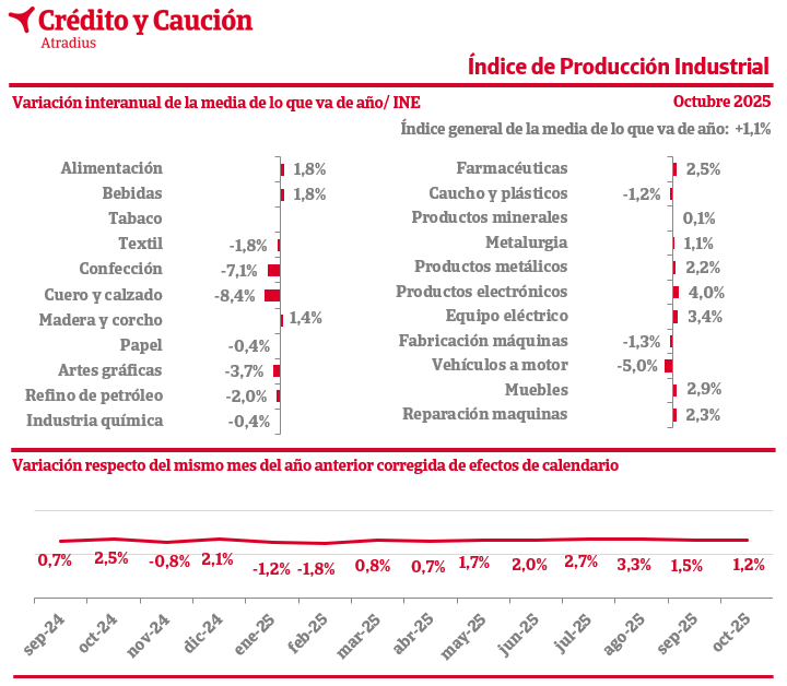El Índice de Producción Industrial en España, creció un 1,1% interanual en octubre, según los datos del INE.
