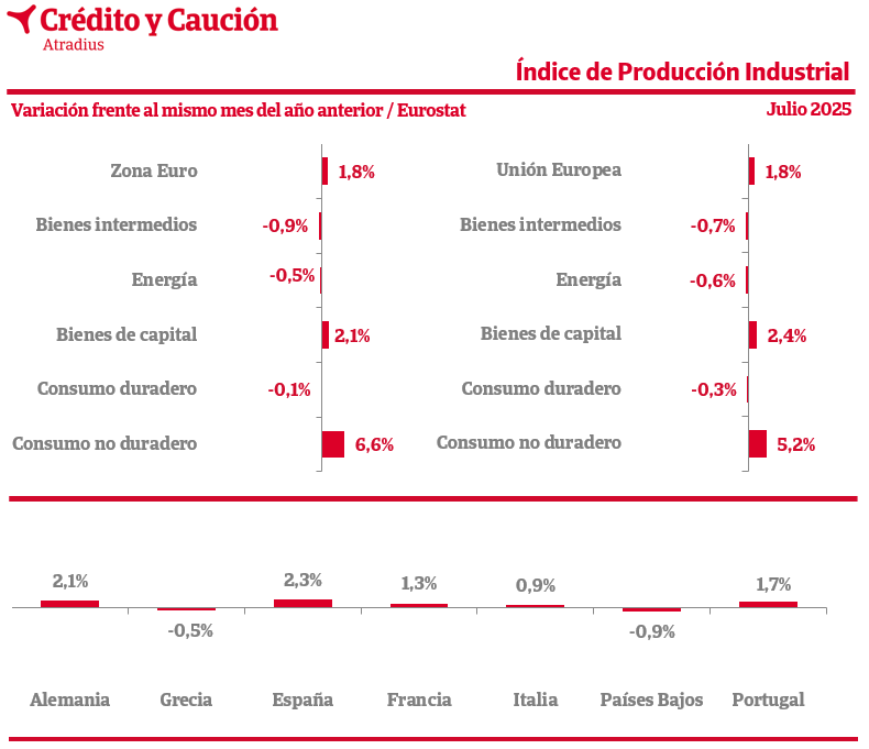 En julio de 2025, la producción industrial creció un 1,8% en la zona euro.