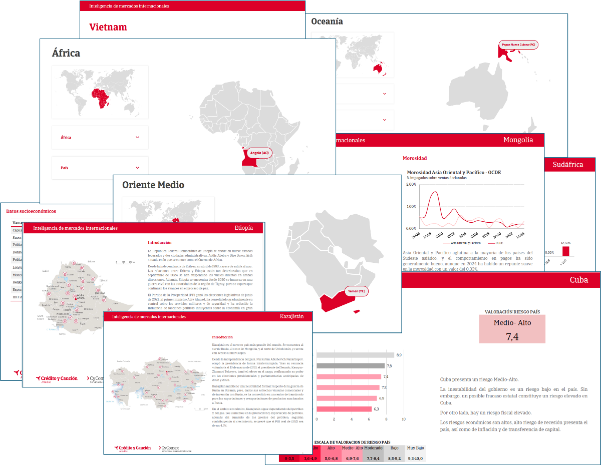 Así, las Fichas de Inteligencia de Mercados Internacionales incluyen datos actualizados clave relacionados con la exportación de cada país, tanto de ámbito socio y macroeconómico (PIB, inflación, deuda pública, negociación, canales de distribución, etc) como indicadores de comportamiento en pagos. En este último aspecto, cabe destacar que se presta especial atención al análisis del riesgo de crédito: plazos de pago, medios de pago, recobros, insolvencias o morosidad. El análisis, control y posterior valoración de "Riesgo País" es un indicador clave para cualquier empresa que intenta diseñar una estrategia de internacionalización.