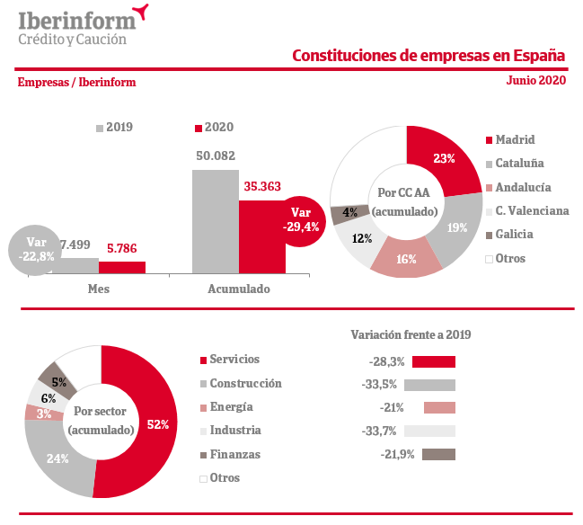De acuerdo con el análisis de Iberinform, la constitución de nuevas empresas se redujo un 23% en junio y las disoluciones un 33%.