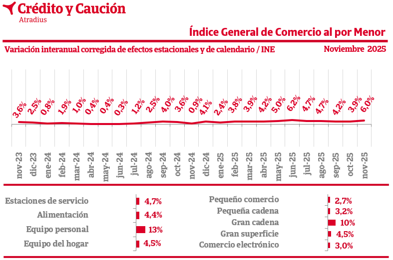 Según los datos del INE, el comercio minorista creció un 6% en noviembre respecto al mismo mes de 2024.