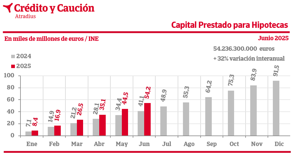 El capital prestado para hipotecas en junio de 2025 crece un 32% interanual, según los últimos datos del INE.