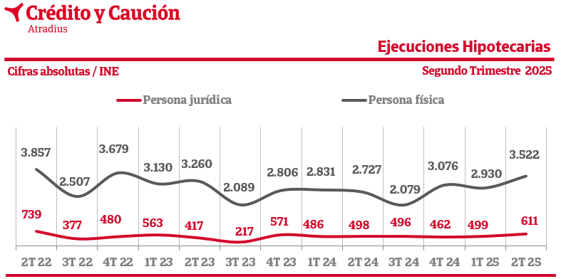 Según los datos del INE, en el segundo trimestre de 2025, las ejecuciones hipotecarias a familias iniciadas e inscritas en los registros de la propiedad suben un 28% en tasa anual.