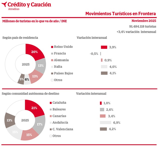 En noviembre, España recibió un 3,4% más de turistas internacionales que en el mismo periodo de 2024, según los datos de la Encuesta de Movimientos Turísticos en Frontera.