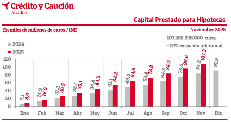 El capital prestado para hipotecas en noviembre de 2025 crece un 27% interanual, según los últimos datos del INE.