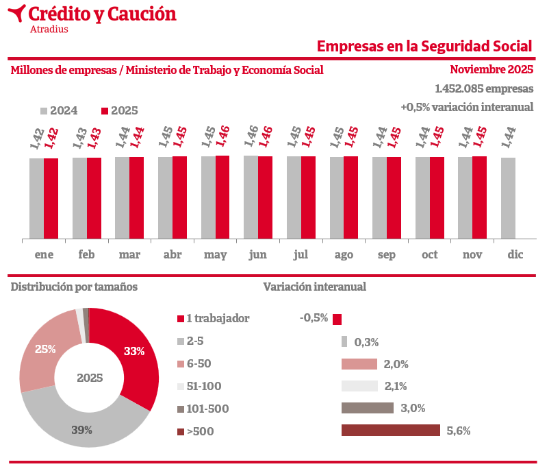 Según los datos de cotización del Ministerio de Trabajo, el número de empresas activas en noviembre de 2025 varió un 0,5% frente a los valores de hace un año.