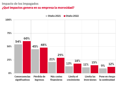 De acuerdo con el Estudio de Gestión del Riesgo de Crédito en España, el 48% de las firmas españolas afronta pérdidas de ingresos significativas a causa de la morosidad, tres puntos más que hace un año. El empeoramiento de los efectos de la morosidad alcanza niveles superiores en aquellos aspectos de la actividad empresarial afectados por el encarecimiento de los tipos de interés: el 29% del tejido empresarial registra un incremento de sus costes financieros (ocho puntos más que en 2021), el 18% tiene que frenar su expansión comercial (cinco puntos más) y el 15% se ve obligado a limitar sus nuevas inversiones (cuatro puntos más).