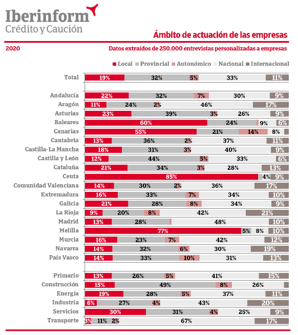 Nueve de cada diez empresas españolas tendrán que afrontar la salida de la pandemia con las oportunidades que le brinde el mercado doméstico, que en algunos casos queda circunscrito a su propio municipio. Solo un 33% de las empresas opera en la totalidad del Estado. El 5% tiene como mercado de referencia su Comunidad Autónoma, el 32% su provincia y un 19% no vende fuera de su municipio. Este porcentaje de empresas locales se dispara en los territorios más insulares como Ceuta (85%), Melilla (77%), Baleares (60%) o Canarias (55%). Por sectores, las empresas de servicios (30%) y de energía (19%) son las más locales frente a las logísticas (3%) e industriales (6%).