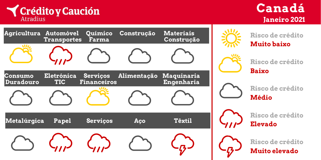 A produção de automóveis é um setor industrial importante no Canadá. A deterioração global da procura provocou tensões na liquidez e falta de capital em muitas empresas. O risco de crédito dos fornecedores Tier II e III aumentou particularmente, já que as empresas ativas nesses segmentos costumam fabricar produtos de baixa tecnologia os substituíveis e têm uma situação financeira mais frágil. Graças aos amplos programas de estímulo, prorrogados até junho de 2021, só se registaram, até agora, alguns atrasos menores nos pagamentos e poucos casos de insolvência. Desde o terceiro trimestre de 2020 iniciou-se uma retoma da produção, mas prevê-se que o valor acrescentado do setor automóvel tenha diminuído 32% em 2020.