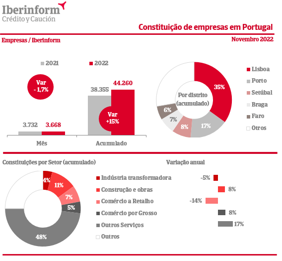 Os primeiros onze meses do ano registam um total de 3.644 insolvências, menos 770 que no mesmo período de 2021, valor que traduz um decréscimo de 17%. Este resultado é o mais baixo dos últimos três anos. A média mensal, em 2022, situa-se nas 331 insolvências contra uma média de 401 em 2021, 420 em 2020 e 418 em 2019. O mês de novembro fechou com um total de 393 insolvências, menos 117 que no período homólogo de 2021 (-23%).
