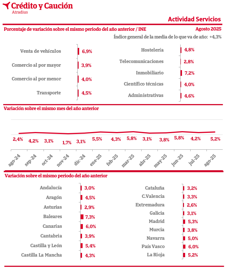 La cifra de negocios del sector servicios en agosto de 2025 en España crece un 4,3% interanual, según los datos del INE.