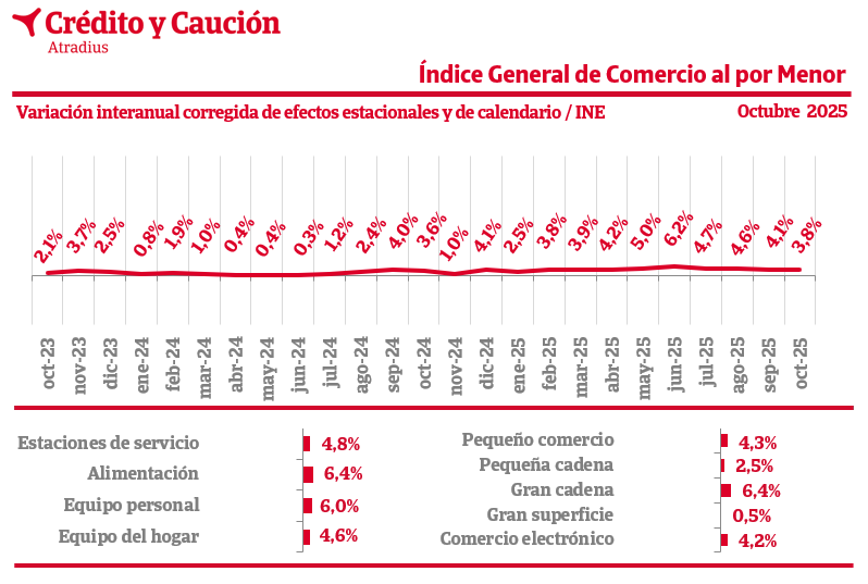 Según los datos del INE, el comercio minorista creció un 3,8% en octubre respecto al mismo mes de 2024.