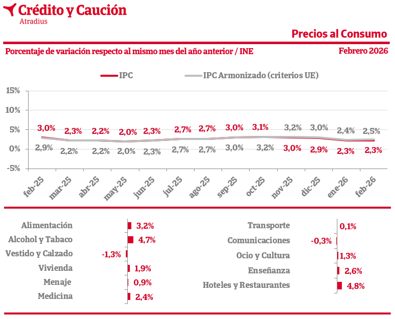 En febrero de 2026, el Índice de Precios de Consumo español (IPC) se sitúa en el 2,3% interanual, según los datos del INE. Los alimentos crecen al 3,2%.
