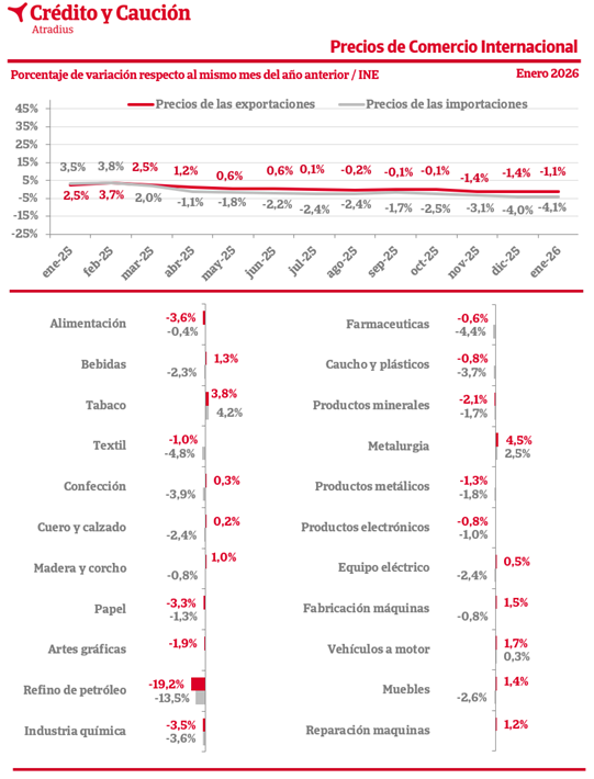Según el INE, en el mes de enero de 2026, los precios de las exportaciones industriales españolas bajan un 1,1%. Por su parte, las importaciones bajan un 4,1%.