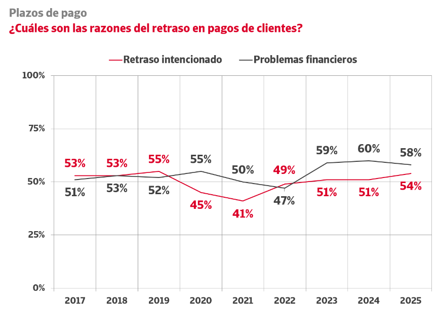 Un 58% de las empresas percibe problemas financieros en sus clientes, dos puntos porcentuales menos que hace un año. La falta de liquidez vuelve a ser la razón más citada para explicar la morosidad empresarial, por delante del retraso intencionado (54%), la complejidad del procedimiento de pagos (17%), las disputas sobre la calidad de los bienes y servicios suministrados (8%) o la emisión de facturas incorrectas (7%).