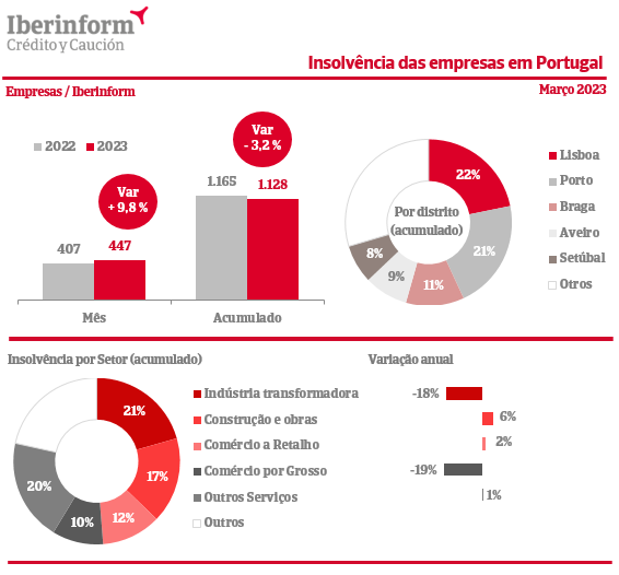 Até final de março, as declarações de insolvência requeridas por terceiros aumentaram 18% face a 2022, com mais 32 declarações, alcançando um total de 215 pedidos. As declarações de insolvência apresentadas pelas próprias empresas subiram 22% face ao primeiro trimestre de 2022, com uma variação de mais 43 empresas e um total de 243 declarações. Quanto aos encerramentos com plano de insolvência regista-se um aumento de 33% face a 2022 (mais dois encerramentos, num total de oito). No primeiro trimestre deste ano foram declaradas insolventes (encerramento de processos) 662 empresas, menos 114 que em 2022, o que resulta numa diminuição no total de ações de insolvência (menos 37 que em 2022).