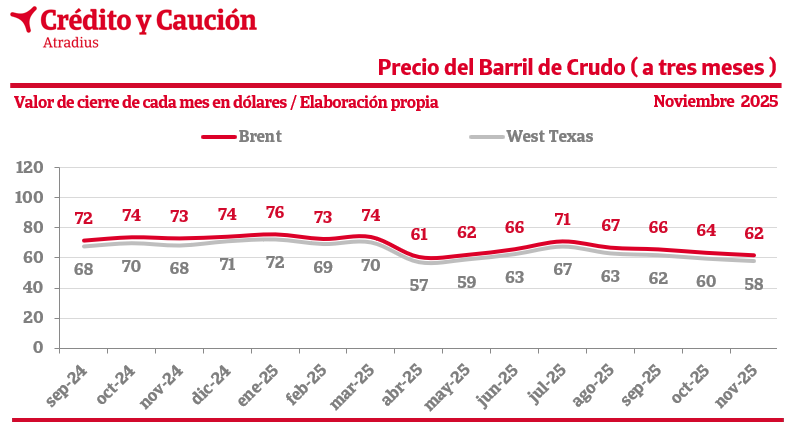 Los precios del barril Brent y West Texas cierran en 62 y 58 dólares, respectivamente, en noviembre de 2025.