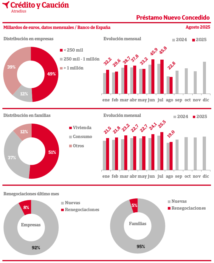 Según datos del Banco de España, en agosto de 2025, el crédito nuevo concedido a empresas alcanzó los 22.804 millones de euros, un 2,2% menos que en 2024.