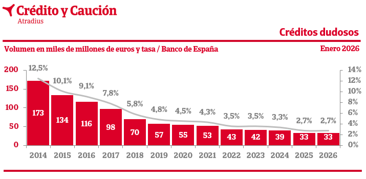 Según los datos provisionales extraídos por Crédito y Caución del último Boletín Estadístico que mensualmente publica el Banco de España, en el mes de enero de 2026, el volumen de créditos de dudoso cobro sumaba 33.186 millones de euros, lo que situó la tasa de morosidad bancaria en el 2,7% del total de crédito concedido.