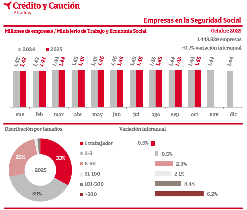 Según los datos de cotización del Ministerio de Trabajo, el número de empresas activas en octubre de 2025 varió un 0,7% frente a los valores de hace un año.