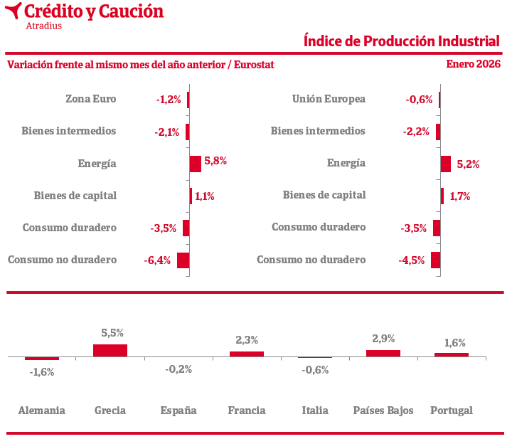 En enero de 2026, la producción industrial decreció un 1,2% en la zona euro.